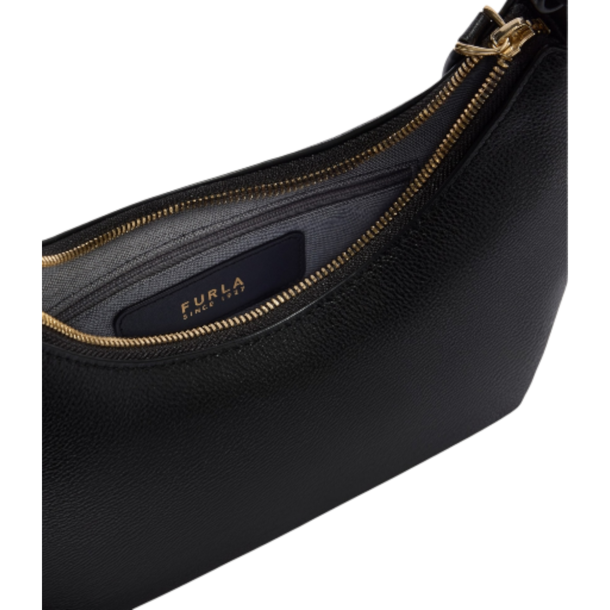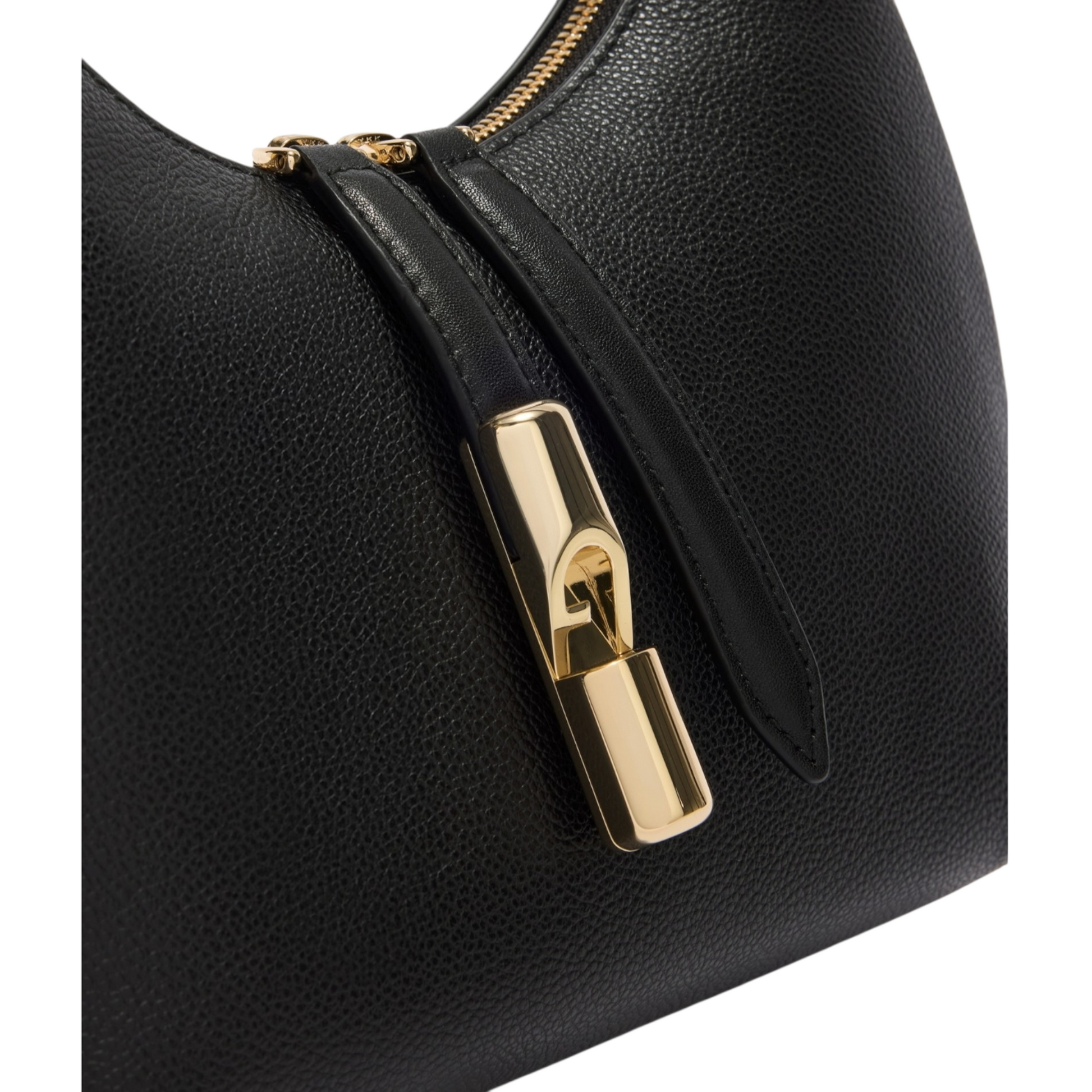 Furla Goccia è la shoulder bag dalle linee morbide e sinuose. In un gioco di contrasti materici tra pelle martellata e dettagli in pelle liscia, si caretterizza per la forma stondata e una silhouette compatta ma spaziosa. La chiusura con doppio cursore a zip è impreziosita dal particolare hardware cilidrinco in finitura lucida con logo Arco su uno dei due puller in pelle.